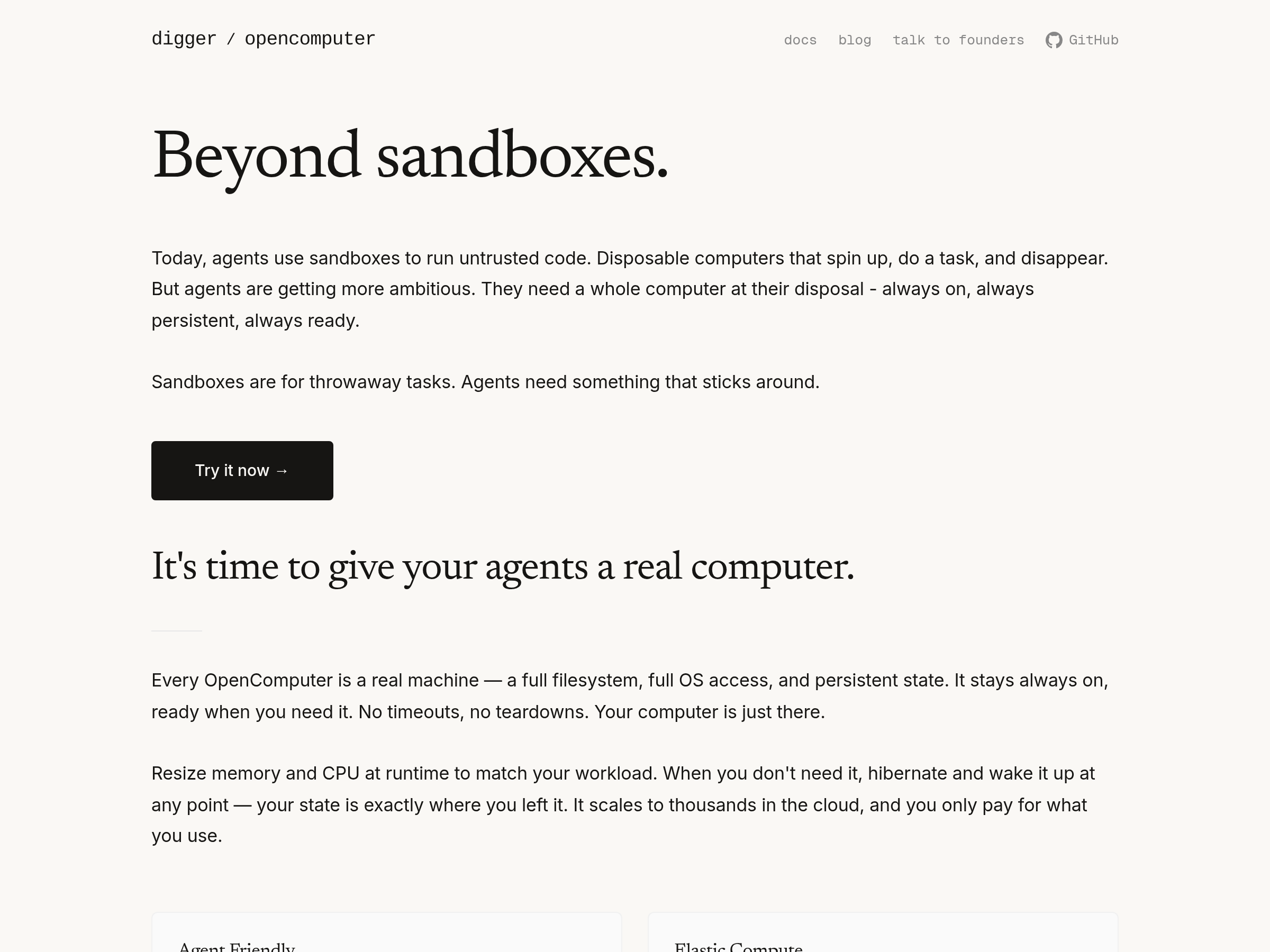 OpenComputer is Digger's 'beyond sandboxes' compute primitive for AI agents — persistent VMs with full OS access, elastic CPU/memory resizing at runtime, instant checkpoints, hibernate/wake with preserved state, and a 20 GB disk per VM. Purpose-built as a harness target for SDKs like Claude Agent SDK: agents install packages once and pick up exactly where they left off across sessions rather than re-bootstrapping every run. Ships a TypeScript SDK (`@opencomputer/sdk`) with Sandbox primitives (commands.run, files.write, etc.), scales to thousands of VMs, and meters at ~$0.02/hour for 4 GB/1 vCPU (disk above 20 GB billed at ~$0.26/GB-month whether the VM is running or hibernated). Positioned for B2B agent platforms — 'if you're building the next Lovable, Devin, or Bolt.'
