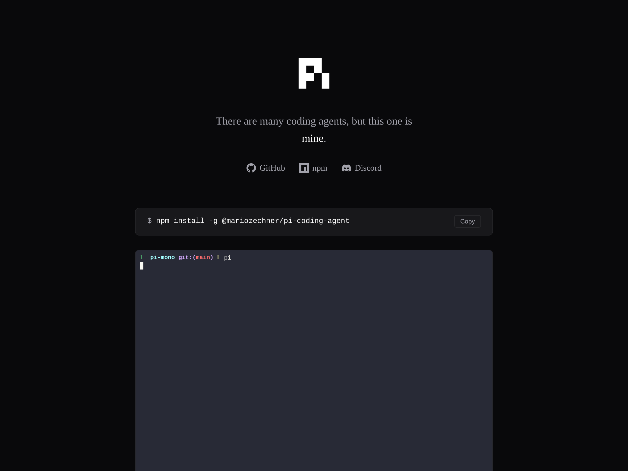 Pi is a minimal, aggressively extensible terminal coding harness by Mario Zechner — installed as an npm global (@mariozechner/pi-coding-agent) and designed so you shape the agent to your workflow instead of the other way around. Supports 15+ providers (Anthropic, OpenAI, Google, Azure, Bedrock, Mistral, Groq, Cerebras, xAI, Hugging Face, Kimi, MiniMax, OpenRouter, Ollama) with mid-session model switching; tree-structured shareable sessions; TypeScript extensions for everything other tools bake in (sub-agents, plan mode, permission gates, sandboxing, MCP integration). Four operating modes: interactive TUI, print/JSON, RPC, and embeddable SDK — OpenClaw uses the SDK as a real-world integration. Deliberately ships *without* MCP, sub-agents, permission popups, plan mode, to-dos, or background bash — build or install what you want. MIT-licensed.