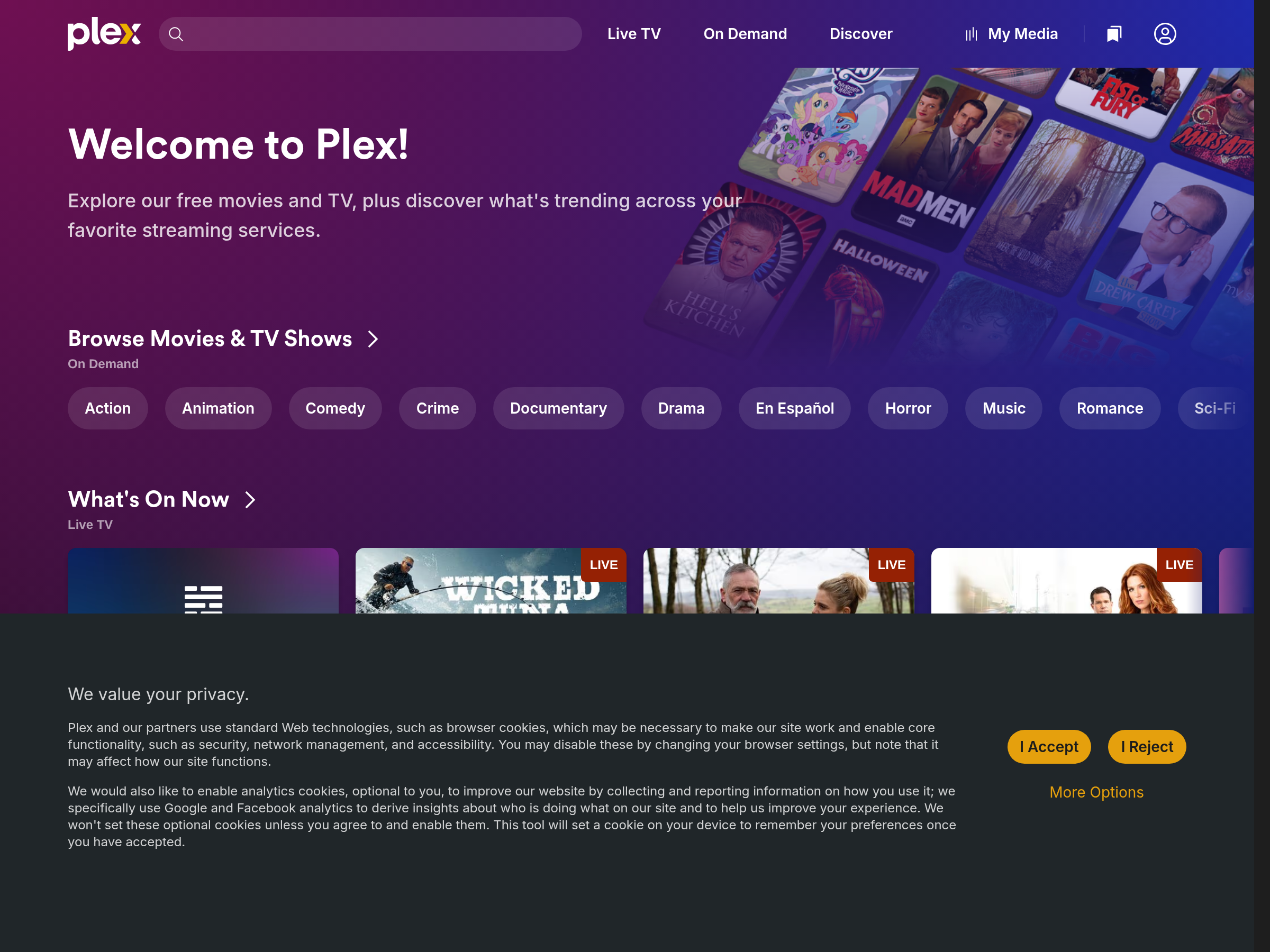 A media streaming platform for organizing and streaming personal movies, TV, music, and photos across devices, with a free ad-supported catalog and optional premium features.