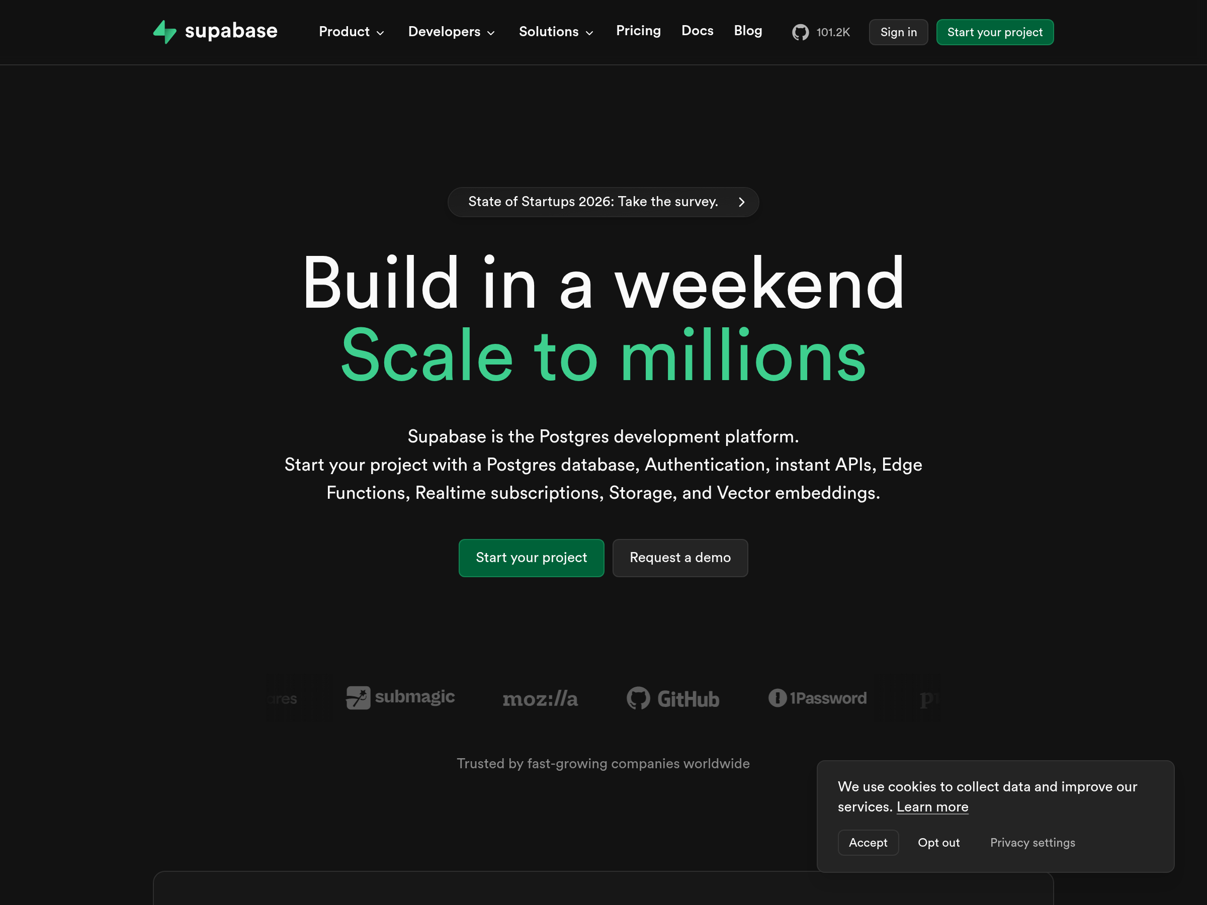 An open-source backend-as-a-service platform for building applications with managed Postgres, authentication, storage, realtime, and edge functions.