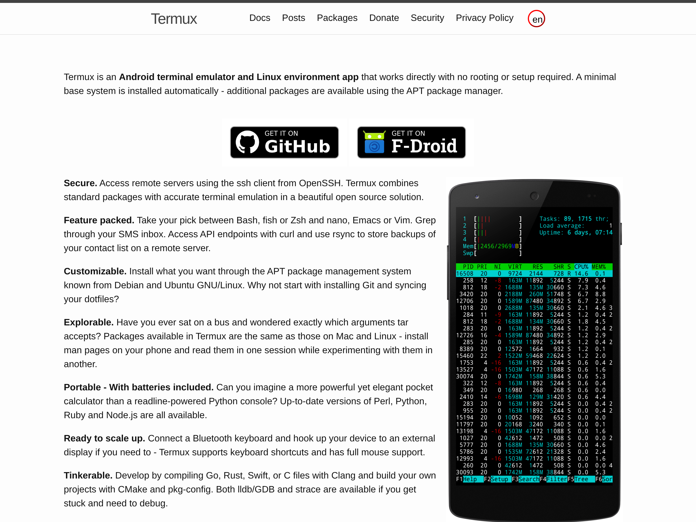 An Android terminal emulator and Linux environment app that provides a command-line interface, package management, and development tools on mobile devices.