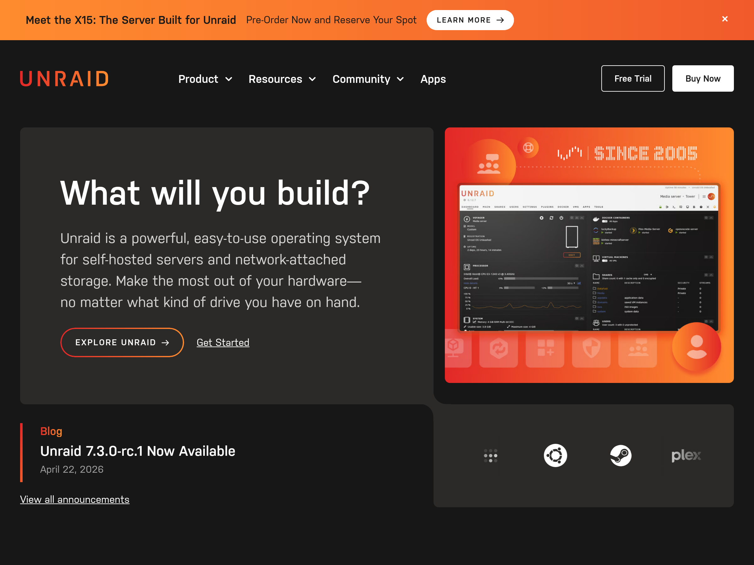 Server operating system for NAS storage, Docker containers, and virtualization on commodity hardware.