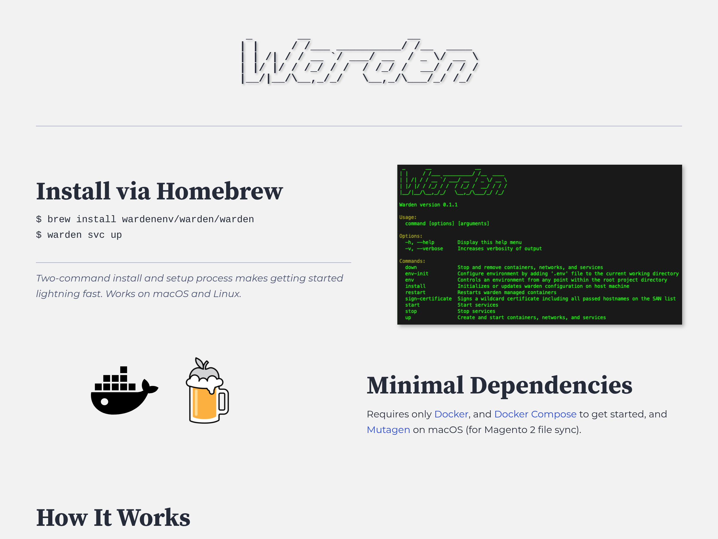 A software product named Warden associated with the official warden.dev documentation site; appears to be a Docker-based local development tool.